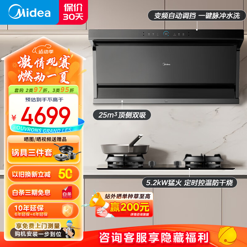 美的(Midea)抽油烟机燃气灶具家用顶侧双吸25风量大吸力变频高压水洗 5.2kW燃气灶烟灶套装DC7+Q715K天然气价格:4699.00元!