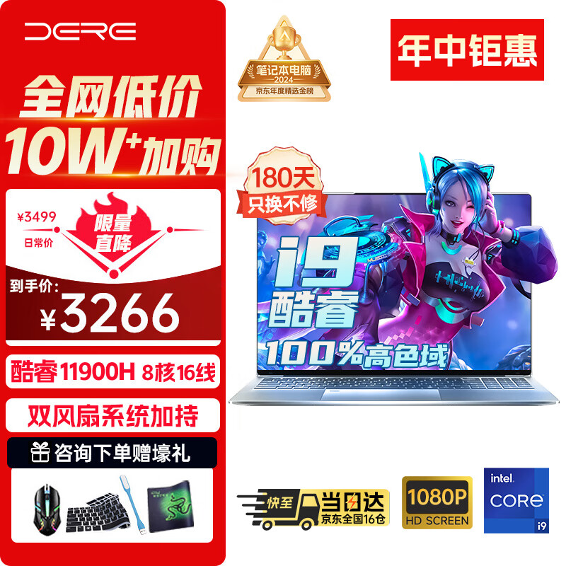 戴睿(dere)超能旗舰16英寸英特尔酷睿i9 笔记本电脑2.5K屏轻薄便携设计商务办公网课游戏本16G/512G魅影灰价格:3256.00元!