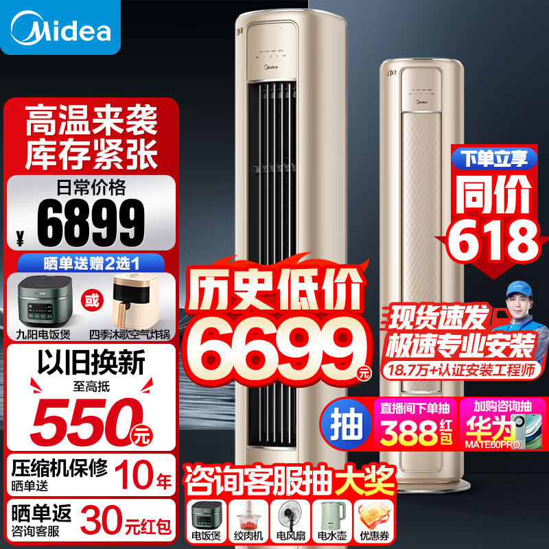 美的(Midea)空调大3匹风尊 新一级能效 变频冷暖 客厅立式空调智能除菌柜机3D立体风防直吹大风口金色圆形柜价格:6699.00元!