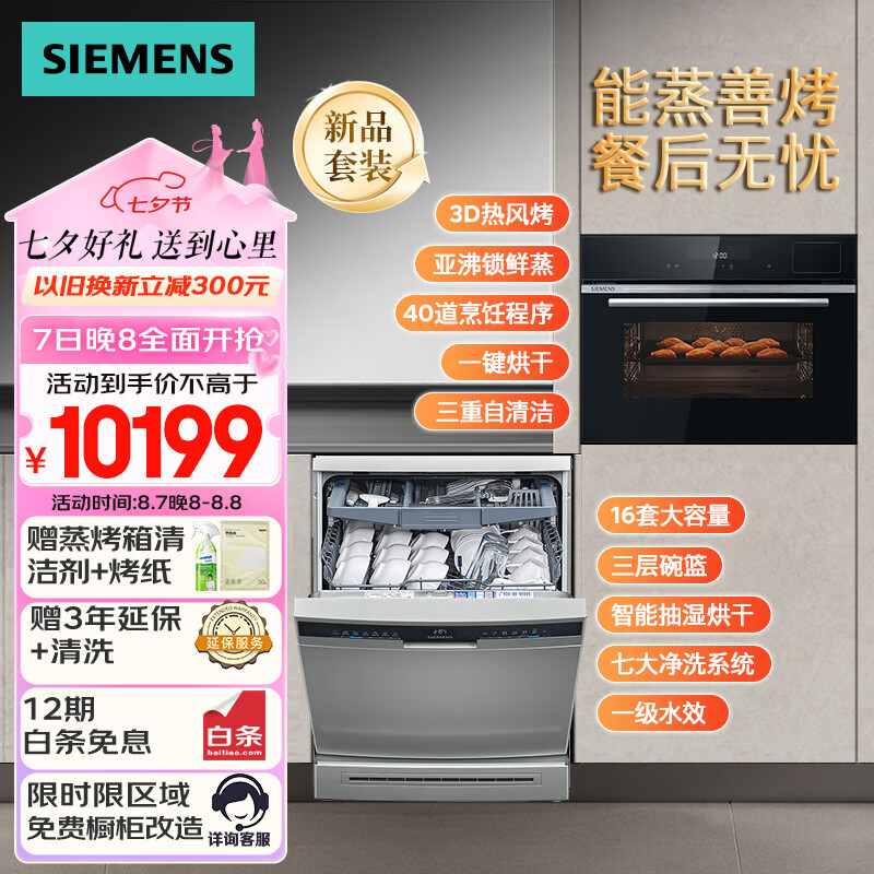 西门子(SIEMENS)洗嵌套装 16套智能抽湿烘干大容量洗碗机 嵌入式蒸烤炸炖四合一套装 CS8J4DNB1W+SJ23HI88MC价格:10199.00元!