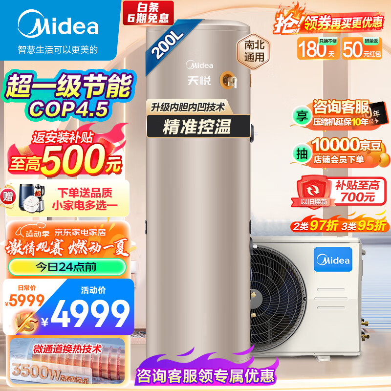 美的(Midea)空气能热水器200升包安装超一级能效75℃高温水洗R32冷媒电辅以旧换新天悦RSJF-35/DN8-200C(E1)价格:5999.00元!
