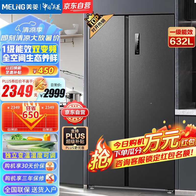 美菱(MeiLing)【离子净】632升对开门双开门家用大容量冰箱一级双变频风冷无霜电冰箱BCD-632WPUCX典雅灰价格:2999.00元!