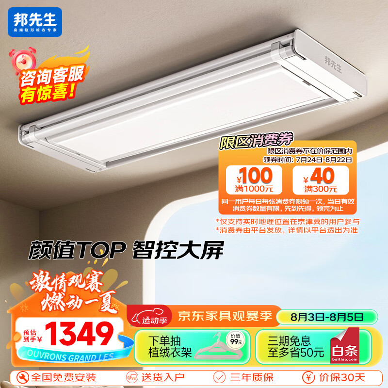 邦先生超薄隐形嵌入式电动晾衣架全自动智能升降阳台消毒凉晒衣机M22C白价格:1349.00元!