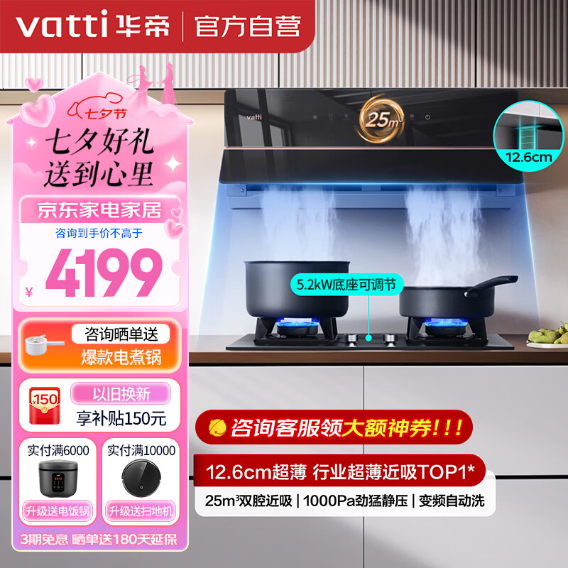 华帝(VATTI)【理想家】抽油烟机官方超薄近吸X6家用侧吸变频大吸力燃气灶具烟灶套装25风量自清洁i11210天然气价格:4199.00元!