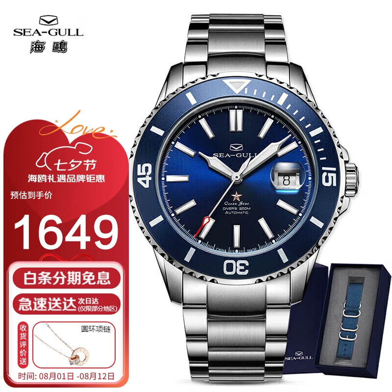 海鸥(SEAGULL)手表男士自动机械表 男表 海洋之星200米防水潜水腕表套装价格:1889.00元!