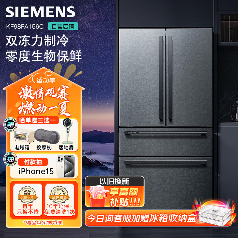 西门子冰箱法式四开门602升家用一级能效变频双冻力制冷零度生物保鲜双擎制冷智能电冰箱KF98FA156C价格:13189.00元!