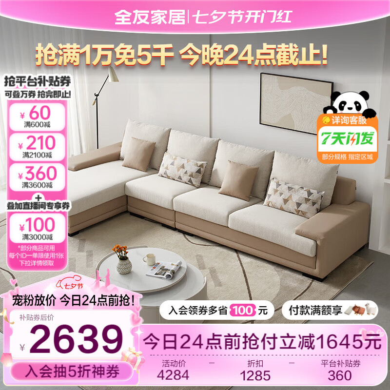 全友家居 现代简约布艺沙发家用大户型客厅实木架贵妃转角沙发102085价格:4284.29元!