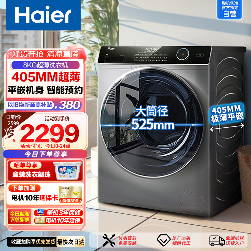 海尔(Haier)滚筒洗衣机8KG超薄家用全自动洗衣机 变频节能巴氏除菌香薰洗洗脱一体大筒径XQG80-B14126L价格:2299.00元!