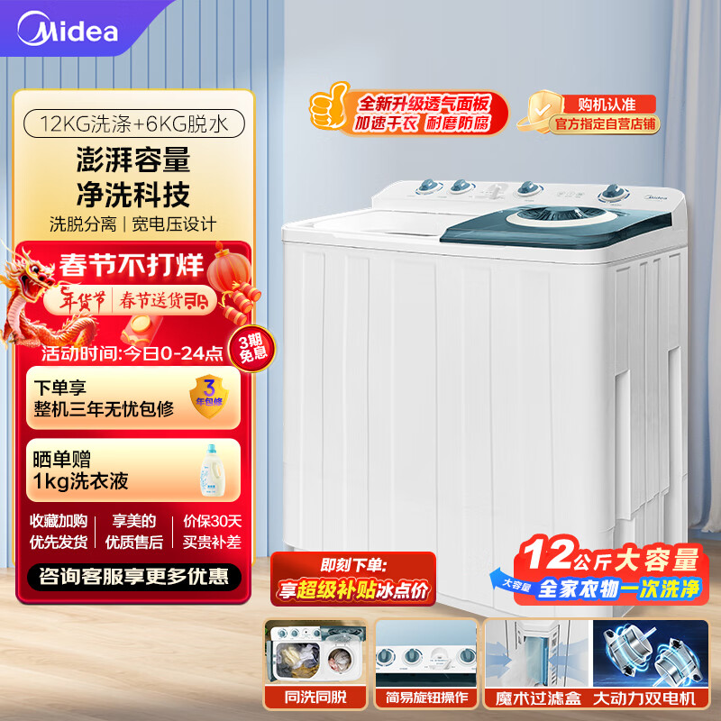 美的(Midea)双桶洗衣机半自动 MP120V513E 12公斤大容量 半自动洗衣机 洗12kg+甩6kg 双缸洗衣机价格:719.00元!