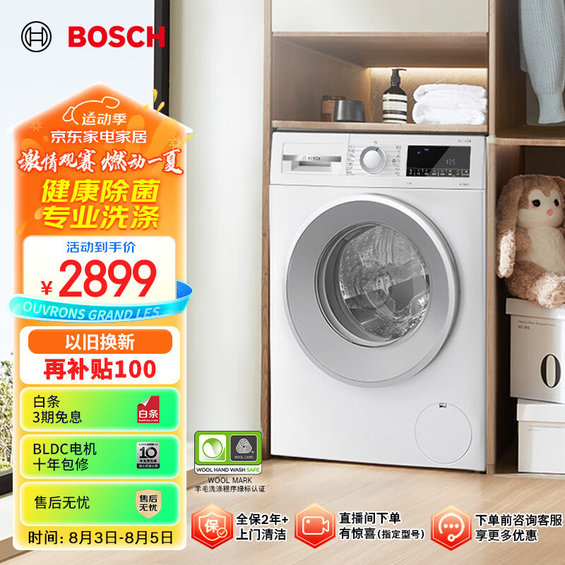 博世(BOSCH)【云朵白·极速版】家用滚筒洗衣机全自动10公斤大容量变频 除菌除螨 快洗 羊毛洗护 WGA152000W价格:2899.00元!