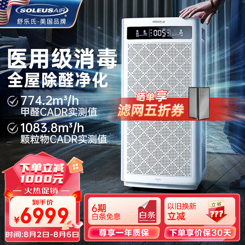 SOLEUSAIR舒乐氏空气净化器除醛除菌宠物吸附猫毛狗毛雾霾异味除花粉过敏原多重污染消毒机 卫健委备案 A10价格:6999.00元!