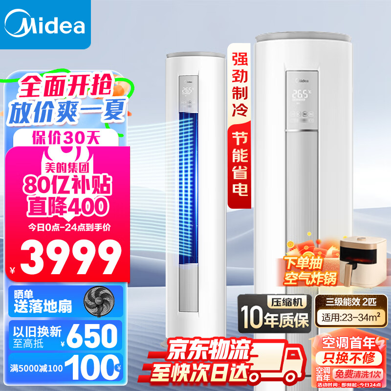 美的(Midea)智行二代自清洁三级能效2匹空调变频冷暖两用制冷制热柜机立式客厅大出风口空调家电以旧换新MJA3价格:3999.00元!