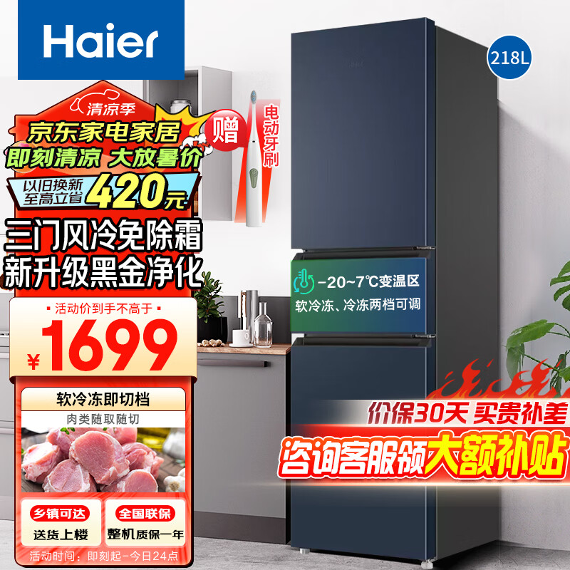 海尔(Haier)冰箱三门218升超薄净味风冷无霜三门三温区小型中型家用节能电冰箱价格:1799.00元!