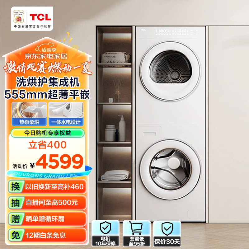TCL 双子舱洗烘护集成机T10 一体式洗烘套装 除菌净螨 10公斤滚筒洗衣机+10公斤热泵烘干GH200T10-W价格:4599.00元!