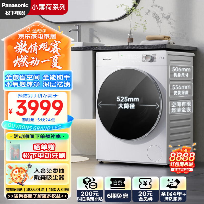 松下(Panasonic)滚筒洗衣机全自动 506超薄全嵌【小薄荷S】10公斤户外服洗1.1洗净比 水氧泡沫净 除菌XQG100-M1F5价格:3999.00元!