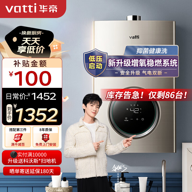 华帝(VATTI)16升燃气热水器天然气节能省气智能恒温气电双断多重防冻低水压启动金色家用i12104-16价格:1352.00元!