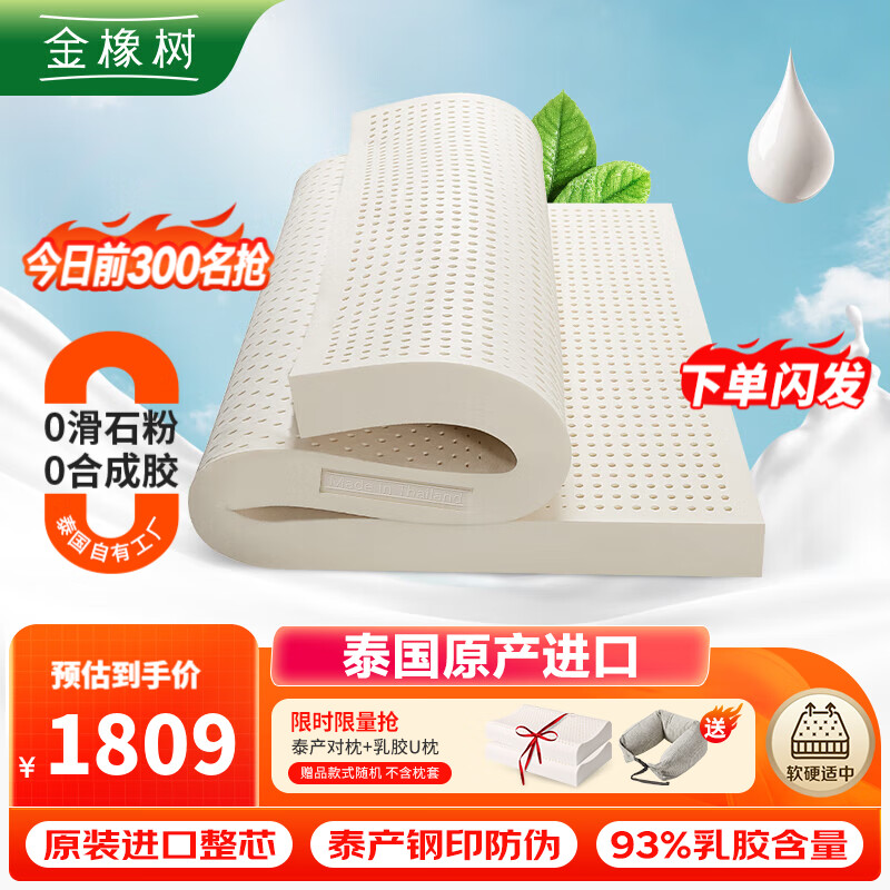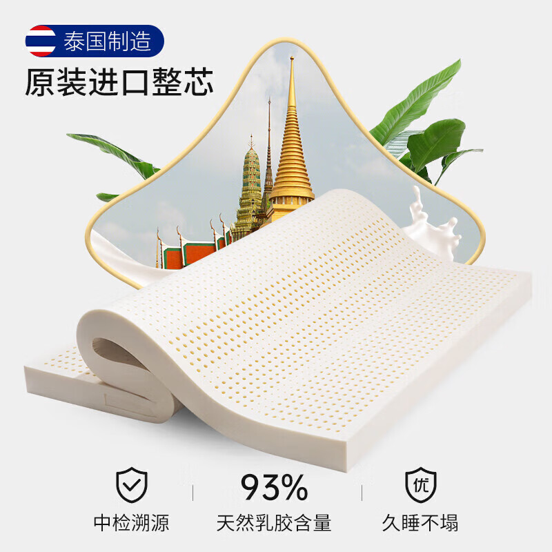 金橡树泰国原产整芯进口天然乳胶床垫双人床垫乳胶垫180*200*10cm 泰优价格:2729.00元!
