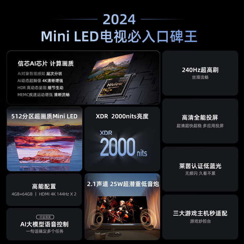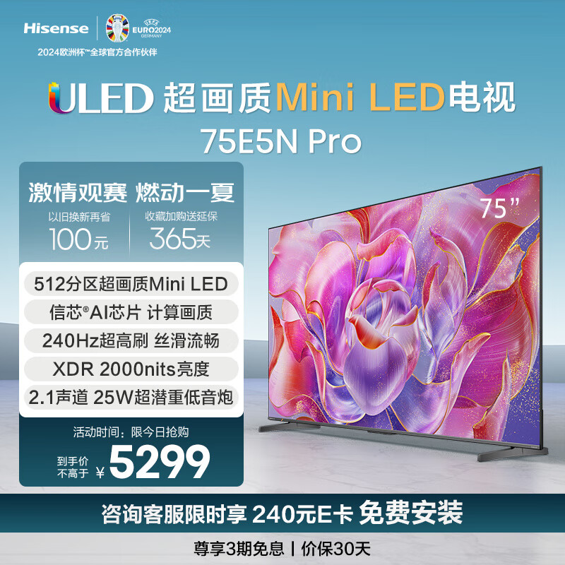 海信电视75E5N Pro 75英寸 ULED超画质 512分区Mini LED 信芯AI芯片 240Hz超高刷 超薄液晶平板电 75英寸价格:6099.00元!