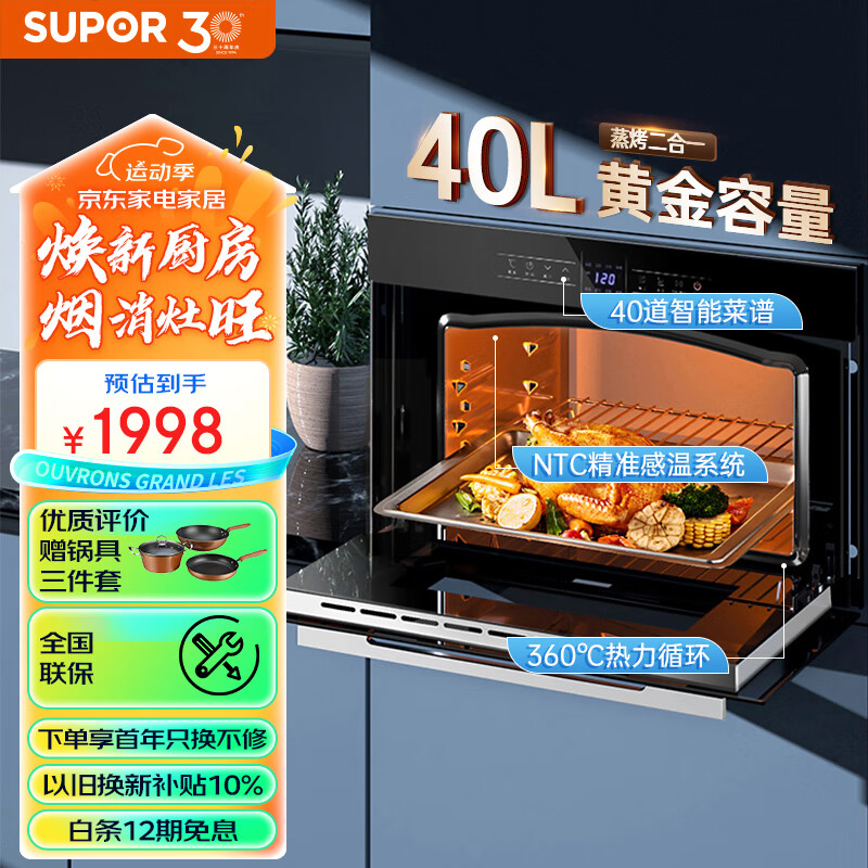 苏泊尔(SUPOR)嵌入式蒸烤箱一体机 家用烤箱 自清洁电蒸箱多功能大容量40L ZKQD40-609价格:1998.00元!
