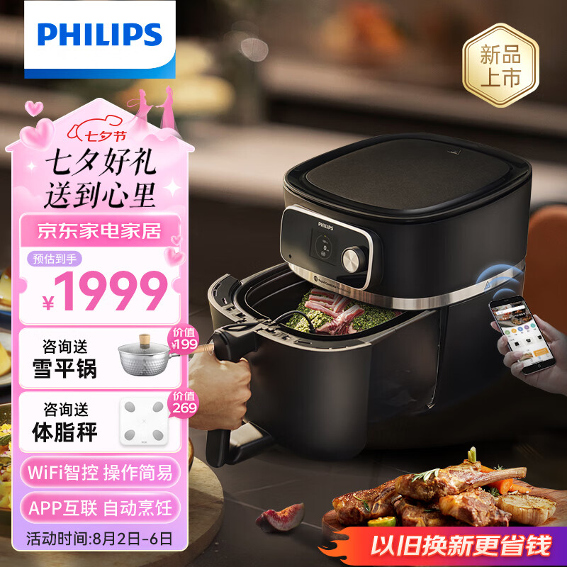 飞利浦(PHILIPS)全新变速空气炸锅8.3L大容量智能烹饪精准控温不用翻面APP智能菜谱多功能烤箱百变空气锅HD9880价格:1999.00元!