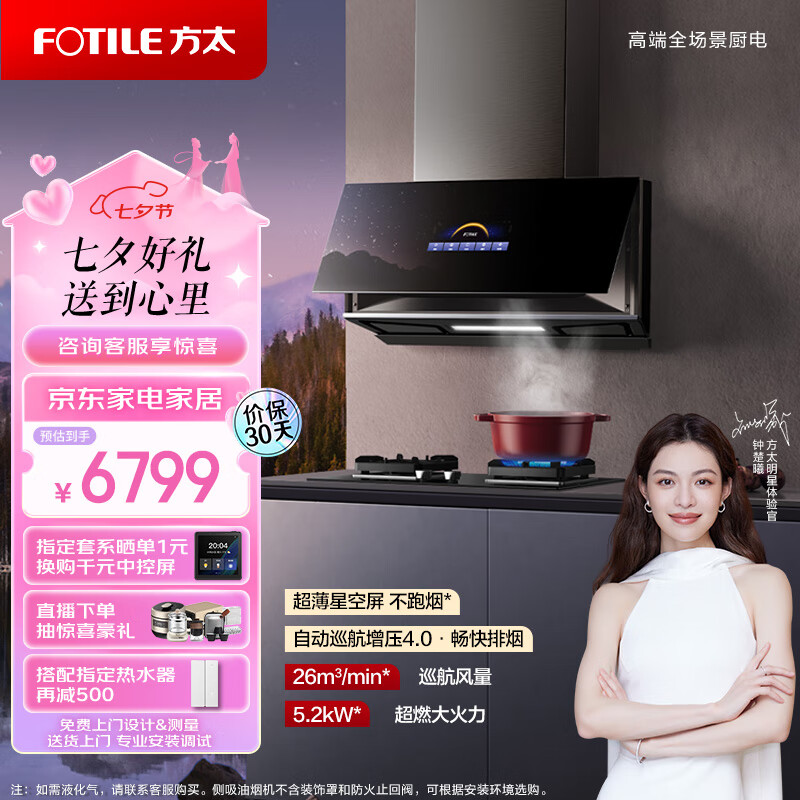 方太抽吸油烟机灶具套装侧吸式变频烟灶26巡航风量超薄近吸5.2kW*燃气猛火双灶 P10.i+02-TH27B天然气价格:6799.00元!