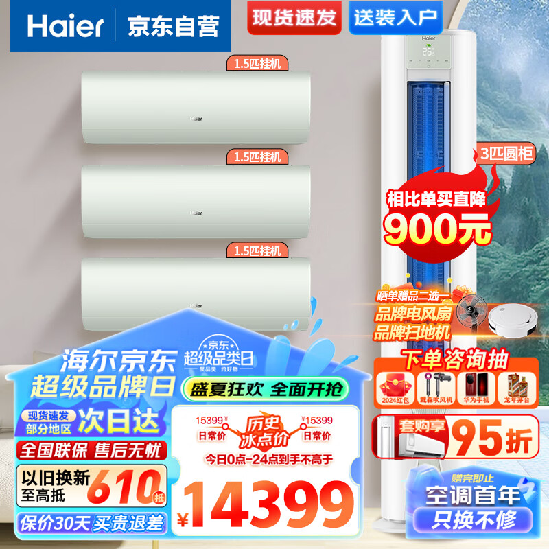 海尔(Haier)空调套装劲爽除醛版 新一级能效变频节能 家用冷暖空调柜机 挂机三室一厅套装以旧换新价格:14399.00元!