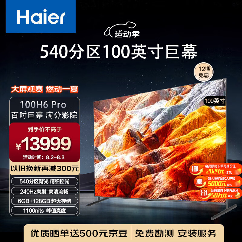 海尔(Haier)100H6 Pro 100英寸电视4K超高清240Hz屏 6+128GB巨幕电视智能液晶平板电视机以旧换新价格:13999.00元!