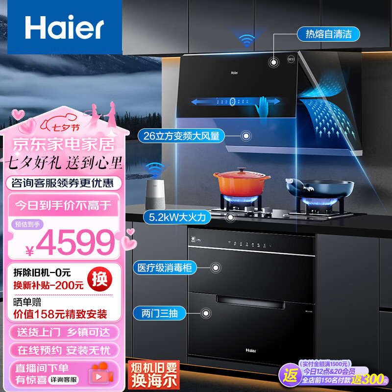 海尔(Haier)抽油烟机 烟灶消三件套 变频 26立方大吸力 5.2kw大火力 110L医疗级消毒柜EC911+Q2BE3天+E07JU1价格:4599.00元!