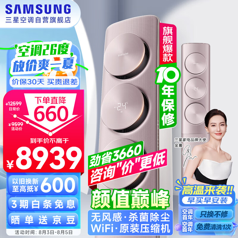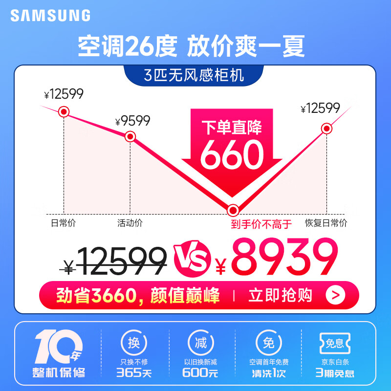 三星空调3匹新三级能效无风感柜机立式WIFI全直流变频除菌冷暖空调38-50㎡适用以旧换新KFR-72L/EBB3价格:8999.00元!