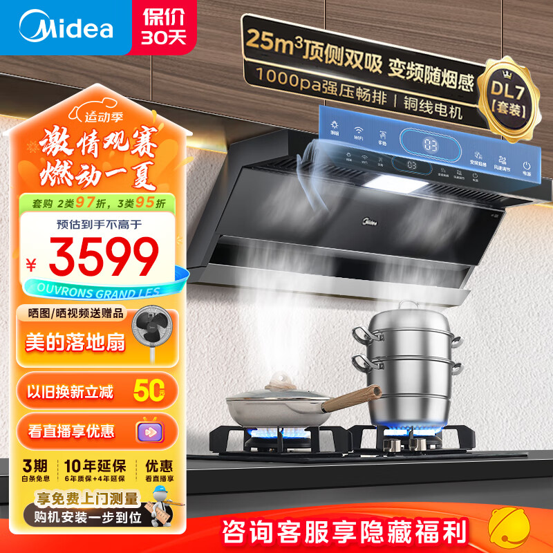 美的(Midea)抽油烟机燃气灶具家用顶侧双吸25风量大吸力变频烟感 7字型排烟机烟灶套装DL7+Q70A天然气价格:3599.00元!