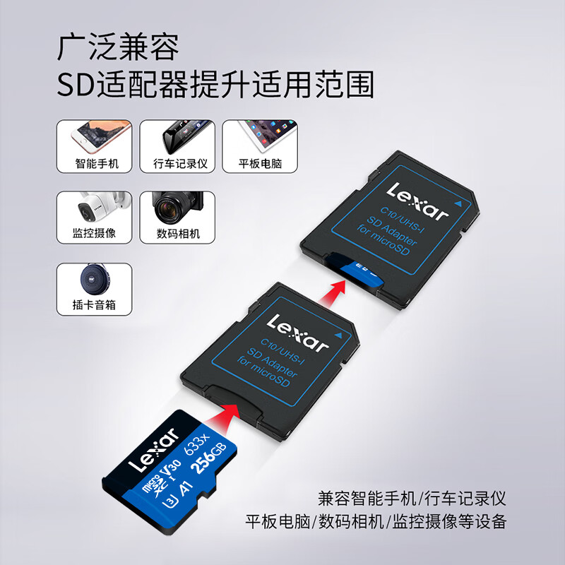 雷克沙(Lexar)256GB TF(MicroSD)存储卡 C10 U3 V30 A1 高速内存卡 读速100MB/s 持久稳定(633x) 价格:159.00元!