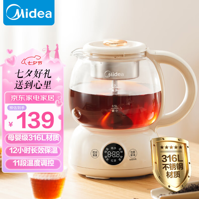 美的(Midea)煮茶器煮茶壶花茶壶 养生壶迷你恒温电热水壶蒸茶器喷淋式316L不锈钢烧水壶黑茶茶具1升YSTM-Z11价格:139.00元!