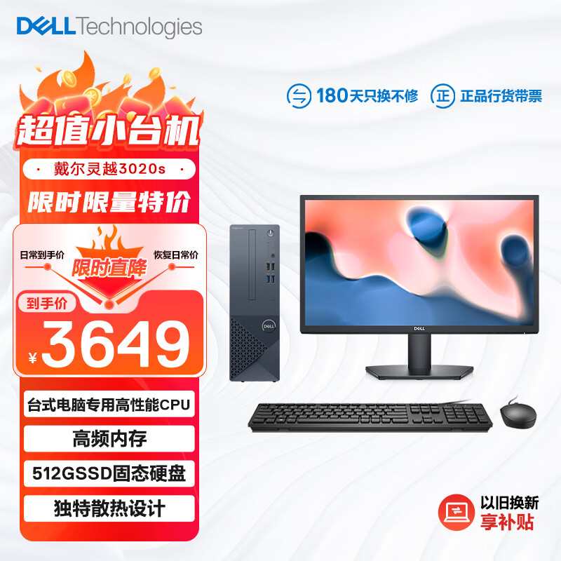 戴尔(DELL)灵越3020S 台式电脑主机 (酷睿13代i5-13400 8G 512GSSD)21.5英寸显示器 高性能CPU价格:3649.00元!