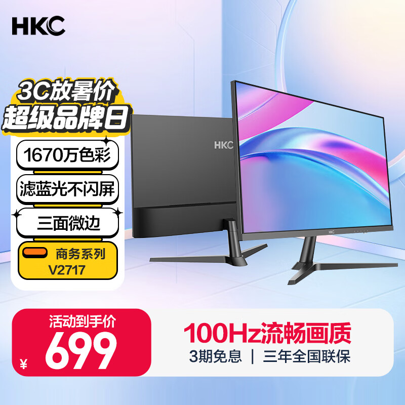 HKC 27英寸 IPS屏 100Hz刷新率 滤蓝光不闪屏三面微边广视角 商务办公设计液晶电脑屏幕 显示器 V2717价格:799.00元!