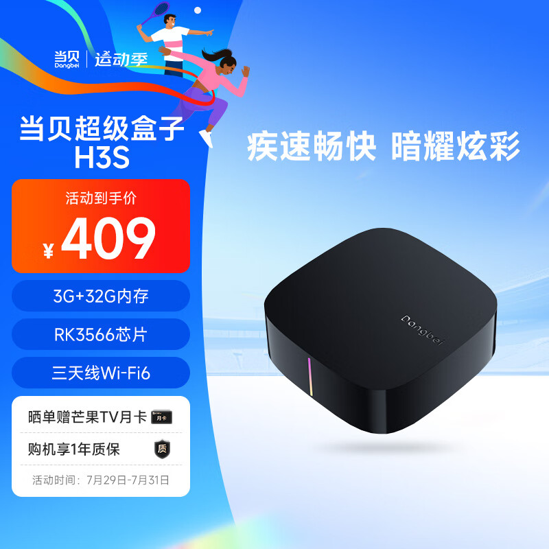 当贝电视盒子 H3S 智能网络电视机顶盒 3G+32G内存 RK3566芯片 8K强悍解码 WiFi6 幻彩呼吸灯价格:409.00元!