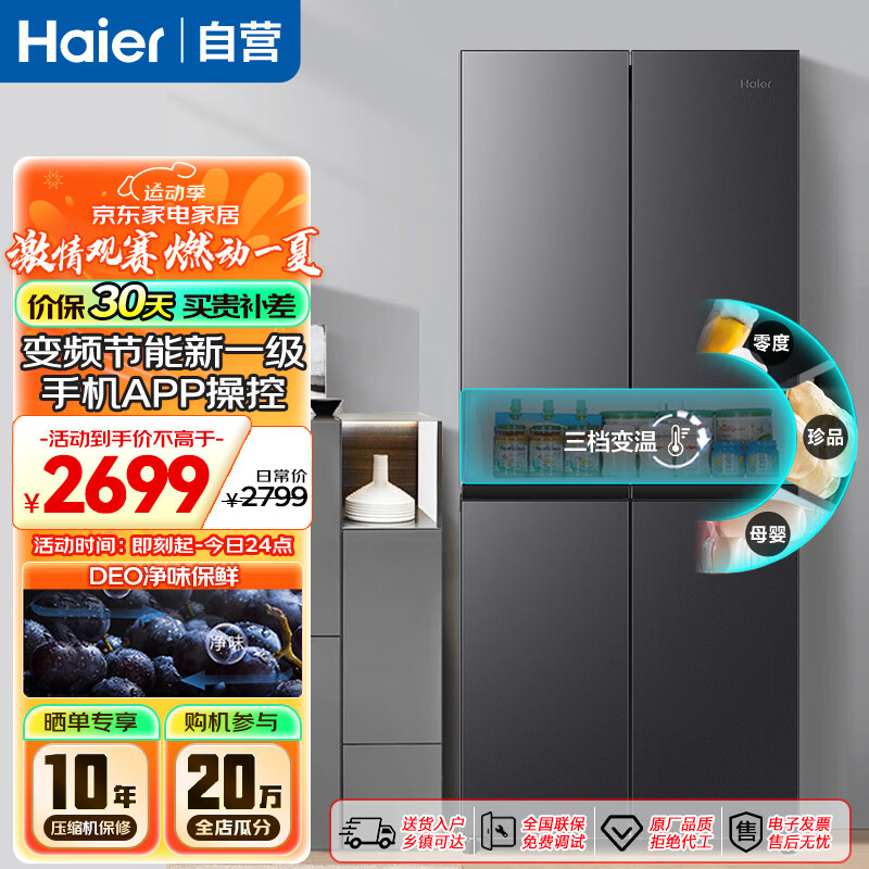 海尔(Haier)冰箱405升十字对开门多门四门大容量变频一级能效风冷无霜家用 超薄手机智控母婴电冰箱价格:2699.00元!