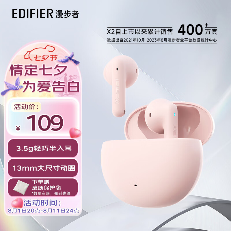 漫步者(EDIFIER)声迈X2 PLUS 真无线蓝牙耳机 原子豆音乐运动耳机 蓝牙5.3 适用苹果华为小米 粉色 七夕礼物价格:109.00元!