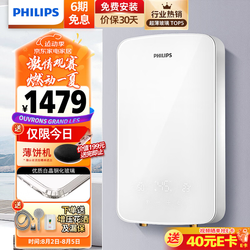 飞利浦(PHILIPS)即热式电热水器 液晶数显超白玻璃屏8500W速热无极变频Ai四季恒温免储水 淋浴洗澡AWH1061/93价格:1579.00元!