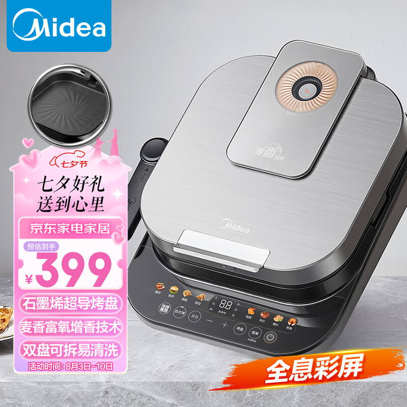 美的(Midea)电饼铛家用双面加热大尺寸上下盘可拆洗大火力智能煎饼烙饼锅三明治早餐机抑制菌涂层无异味3082价格:399.00元!