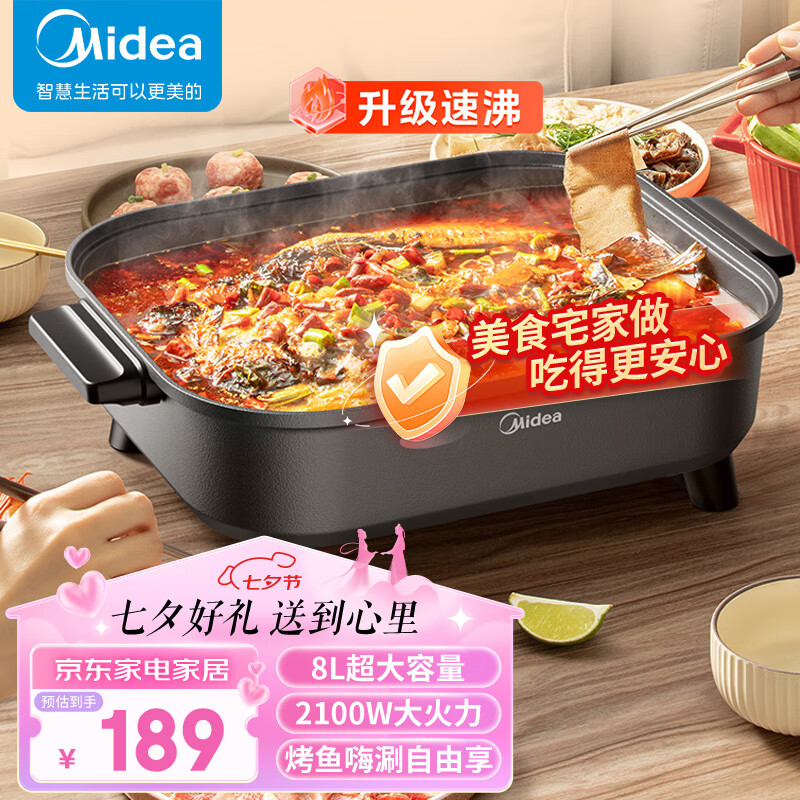 美的(Midea)火锅专用锅 电火锅 烤鱼锅6分钟速沸电锅一体多功能锅电煮锅火锅锅 8L大容量 HGE383051价格:189.00元!