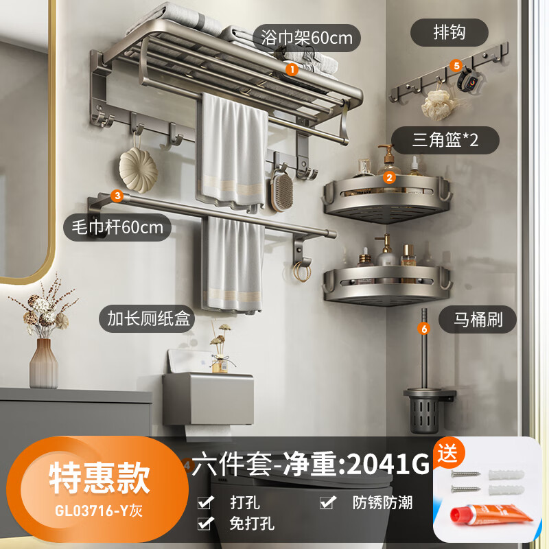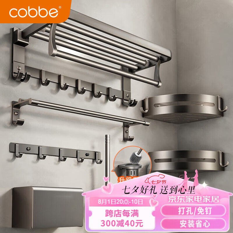 卡贝(cobbe)浴室毛巾架免打孔枪灰色太空铝卫生间置物架厕所洗手间浴巾架套装价格:318.00元!