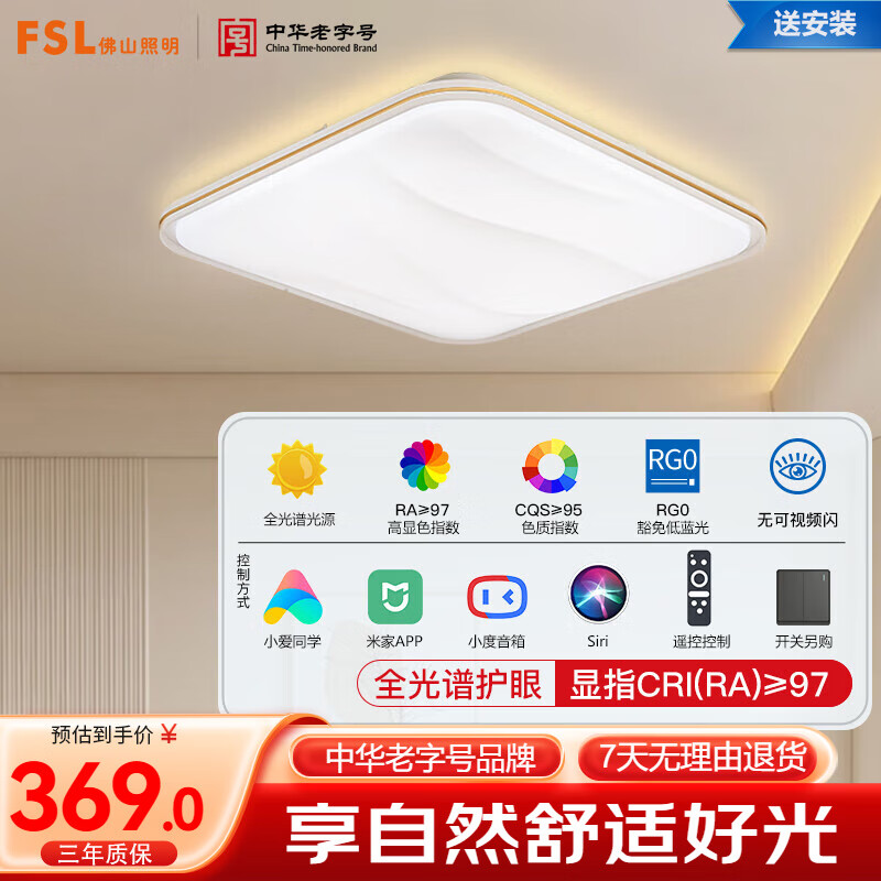 FSL佛山照明吸顶灯LED卧室灯低蓝光护眼高显97米家灯具灯饰清羽36W价格:399.00元!