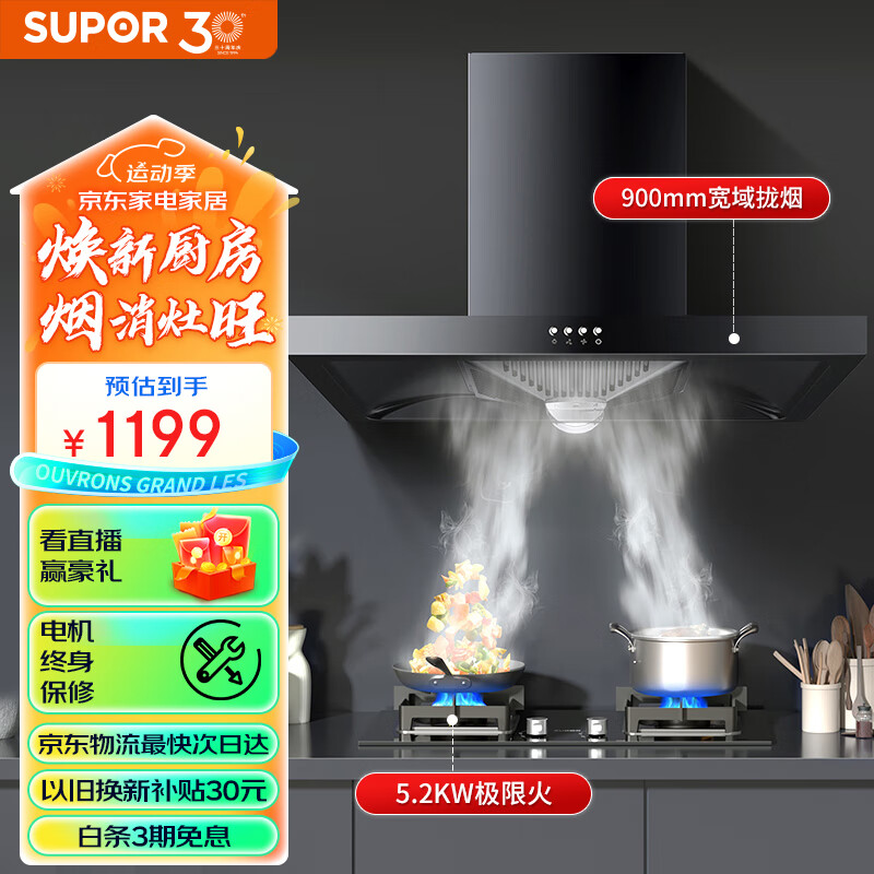苏泊尔(SUPOR)排油烟机 宽域拢烟大吸力油烟机 家用易清洁欧式顶吸抽油烟机 吸油烟机燃气灶套装DT10+DB27液化气价格:1199.00元!