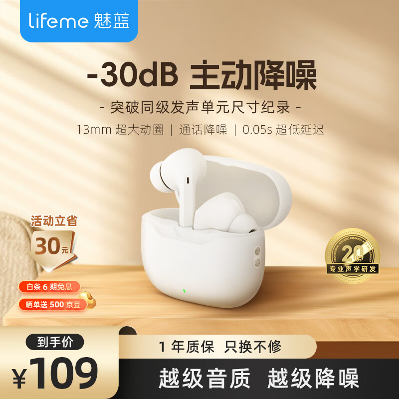 魅蓝魅族lifeme Blus L 真无线蓝牙耳机 ANC主动降噪入耳式耳机 通话降噪 蓝牙5.3 适用苹果/华为手机价格:139.00元!