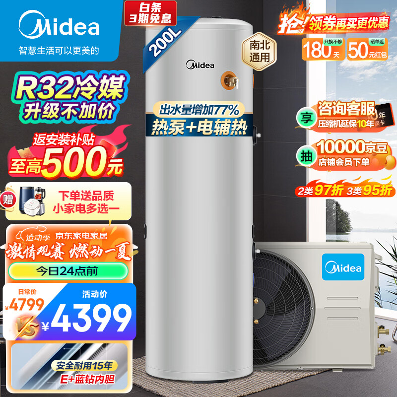 美的(Midea)空气能热水器200升包安装 电辅速热WIFI智控R32冷媒以旧换新热水王RSJF-33/DN8-200D(E2)(4-6人)价格:4799.00元!