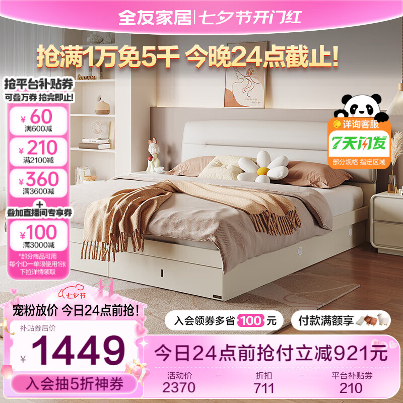 全友家居床现代奶油风科技布软包床轻奢主卧室床1.5x2米双人床DG10001价格:2370.00元!