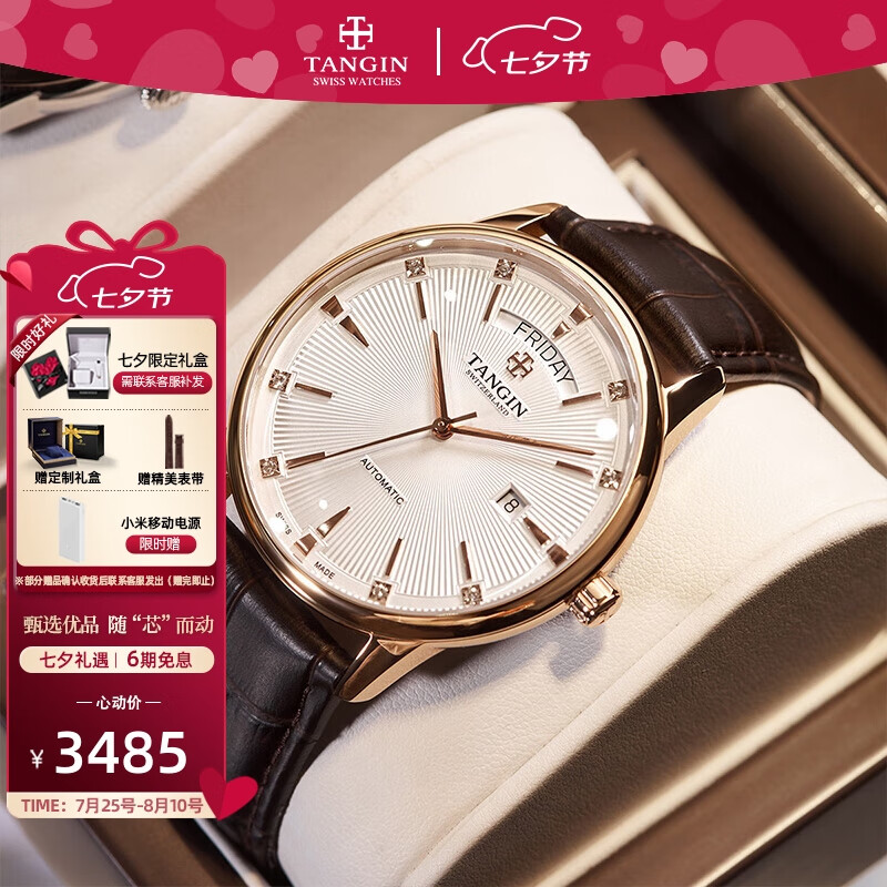 天珺(TANGIN)瑞士手表男 机械男士手表时尚皮带瑞表 七夕礼物送男友价格:4005.00元!