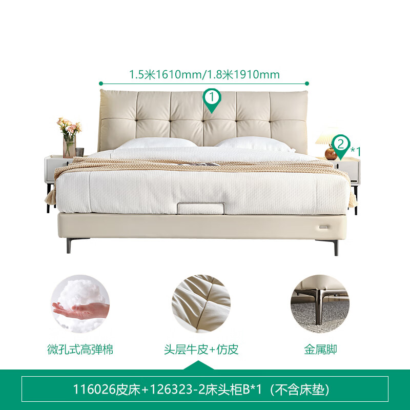 全友家居 奶油风真皮云朵床1.5x2米主卧室家具软包高脚双人床116026价格:3712.86元!