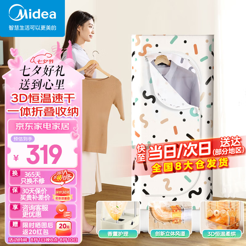 美的(Midea)烘干机家用干衣机 衣服烘干机定时小型 折叠婴儿暖风烘衣机 3D恒温柔烘衣物护理机MHJ70-02L价格:319.00元!