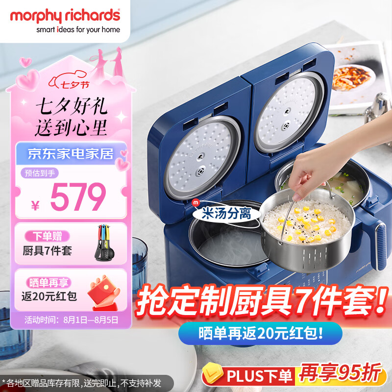 摩飞电器(Morphyrichards)双胆电饭煲电饭锅 家用多功能2+2L双胆双控二合一煮饭微压煲汤低糖煮饭煲煲汤锅 MR8501轻奢蓝价格:579.00元!